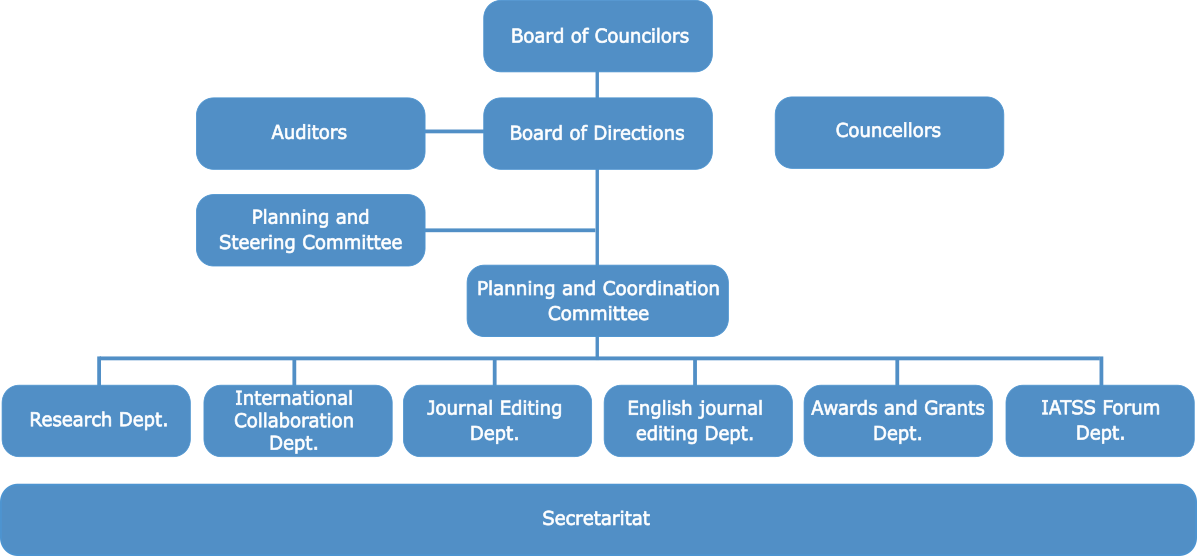 The IATSS is composed of councilors, directors, and departments that lead the Association's activities. Specifically there are the following four departments: (1) Research Department, (2) International Collaboration Department, (3) Journal Editing Department, (4) English Journal Editing Department, (5) Awards and Grants Department and (6) IATSS Forum Department. The activities of these departments are coordinated by the Planning and Coordination Committee. Members of the Association belong to these departments to conduct research activities and promote various projects. In principle, they also participate in the committees established within the departments.