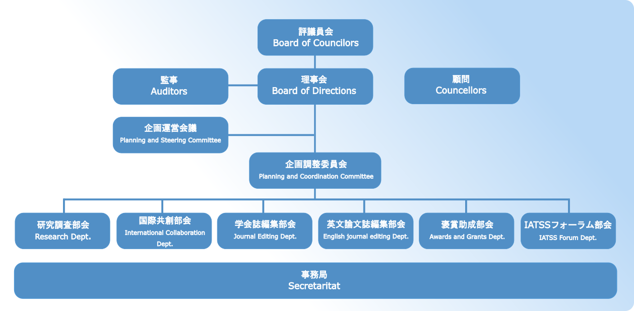 当学会は公益財団法人として、評議員会、理事会、活動の主体となる6つの専門部会((1)研究調査部会 (2)国際共創部会 (3)学会誌編集部会 (4)英文論文集編集部会 (5)褒賞助成部会 (6)IATSSフォーラム部会)によって構成されています。専門部会の上には、 それらの活動の連絡調整を主機能とする企画調整委員会を設けています。会員は専門部会に所属し、研究調査活動のほか、諸事業を直接推進することに加え、各部会内に設置される委員会に委員として参画して活動することを基本としています。
