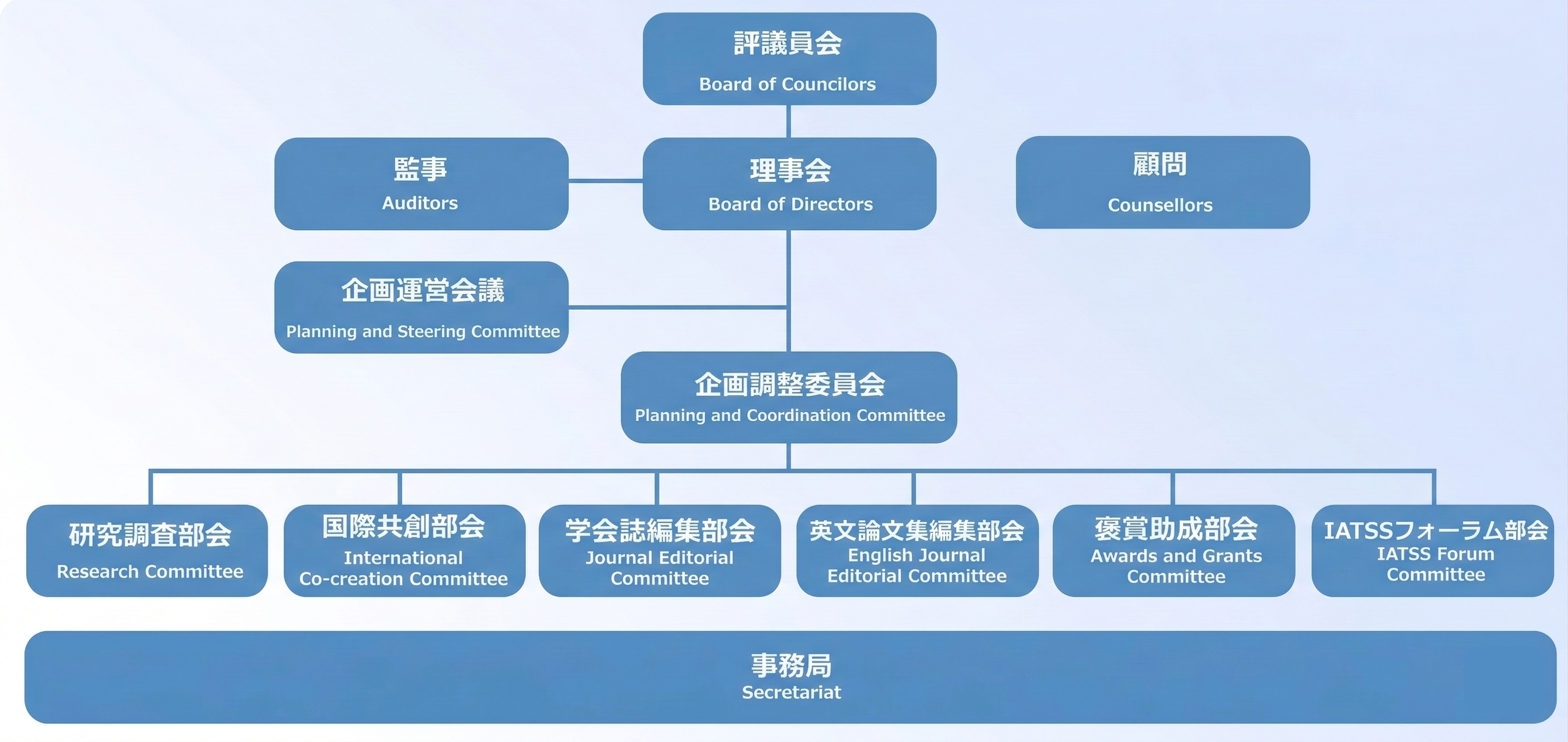 当学会は公益財団法人として、評議員会、理事会、活動の主体となる6つの専門部会((1)研究調査部会 (2)国際共創部会 (3)学会誌編集部会 (4)英文論文集編集部会 (5)褒賞助成部会 (6)IATSSフォーラム部会)によって構成されています。専門部会の上には、 それらの活動の連絡調整を主機能とする企画調整委員会を設けています。会員は専門部会に所属し、研究調査活動のほか、諸事業を直接推進することに加え、各部会内に設置される委員会に委員として参画して活動することを基本としています。